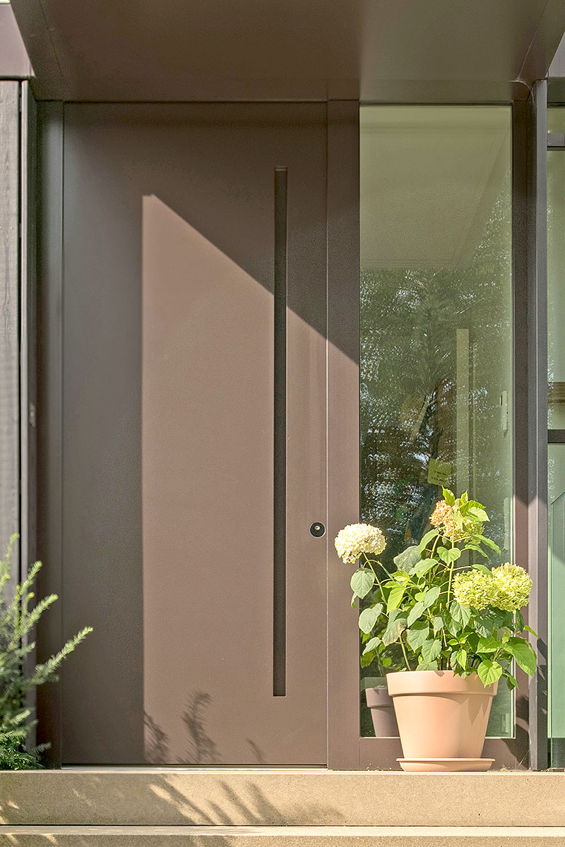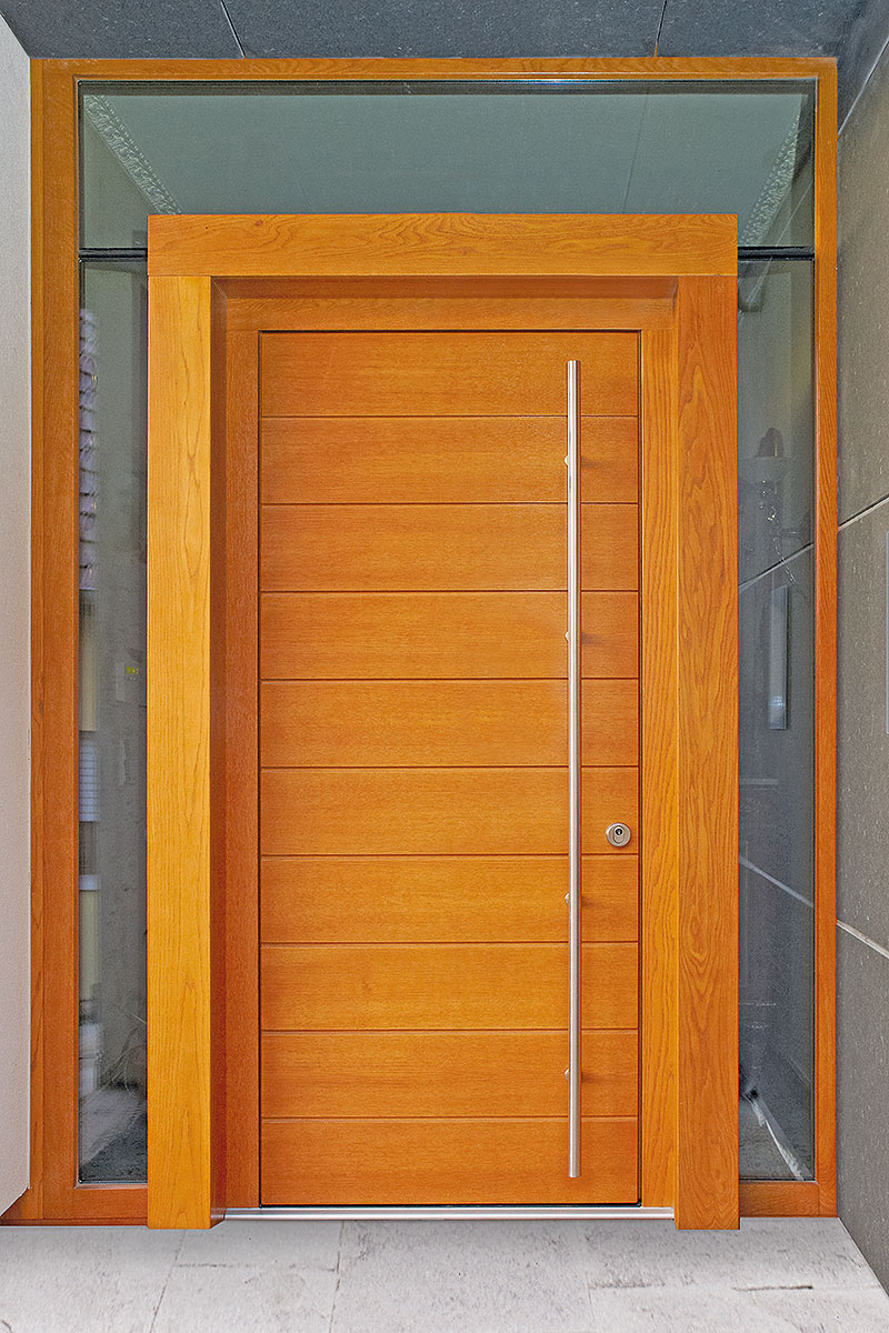 Ästhetik a Kombinatioun: mir gestalten a konstruéiere modern Aganksdieren aus Holz mat héichwäerteger Aluminiumschuel – an dës natierlech an alle belibege RAL-Faarwen. Ob méifligeleg oder mat fixe Säitendeeler, a Kombinatioun mat Uewerliichter a grousse Glasfläschen oder als Deel vun enger transparenter Poste-Rigel-Konstruktioun – eis Diere kënne flexibel no Äre Virgabe realiséiert ginn. Den Asaz vun Aluminium weist awer net nëmme just am Bausseberäich Wierkung: als dauerhafte Witterungsschutz erlaabt d’Aluminiumschuel d’Benotze vu besonnesch nobelem Holz ob der Bannesäit vun der Dier – mat entspriechendem optesche Reiz.